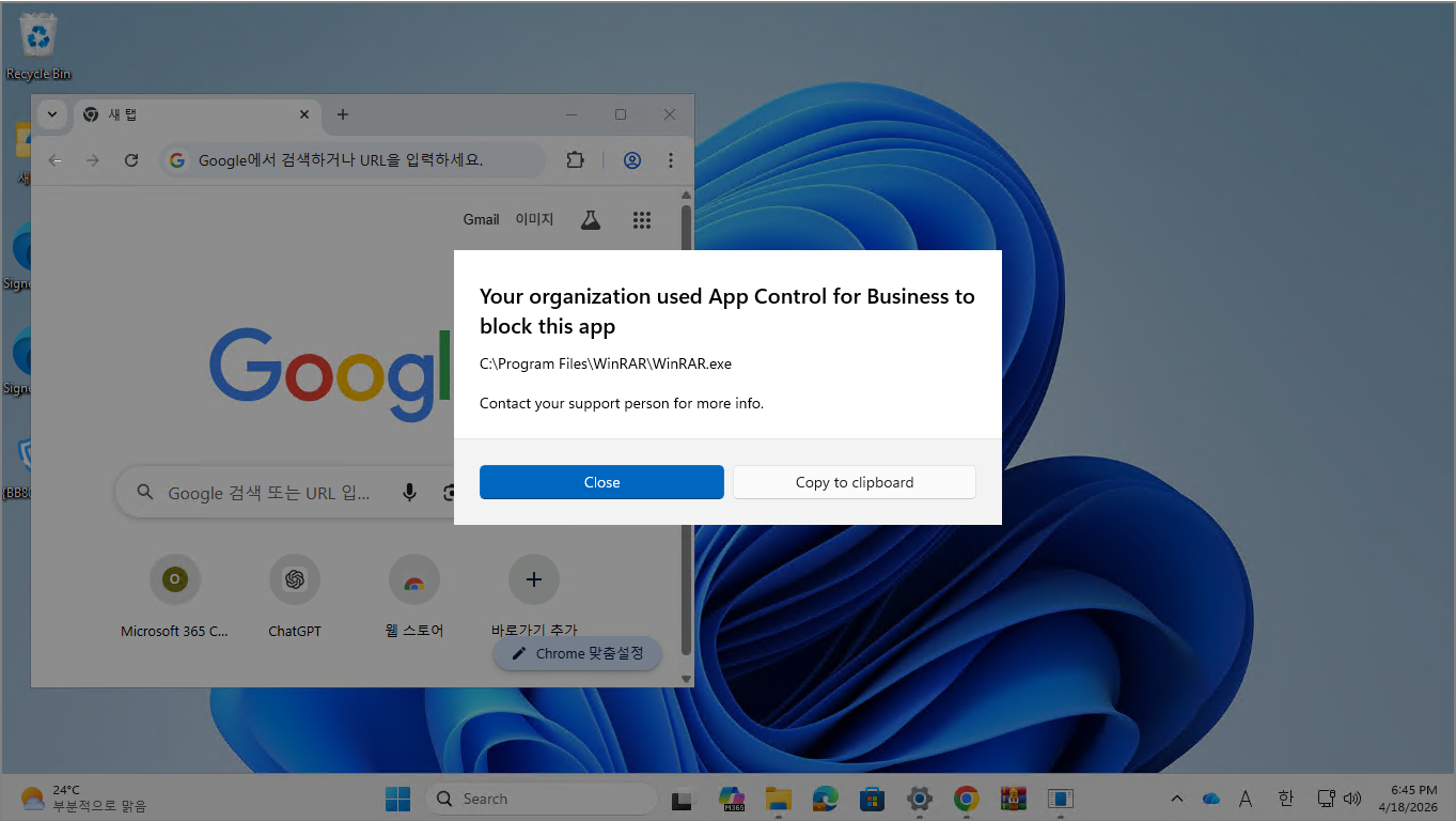 허용 경로 외의 파일은 모두 차단됩니다. 예를 들어 Chrome 설치 파일을 바탕화면에서 실행하면 다음과 같이 차단됩니다. 이를 통해 사용자의 임의 앱 설치를 억제할 수 있으며, 필요 시 Downloads 등 특정 경로를 Allow 규칙에 추가해 설치를 허용할 수 있습니다.
