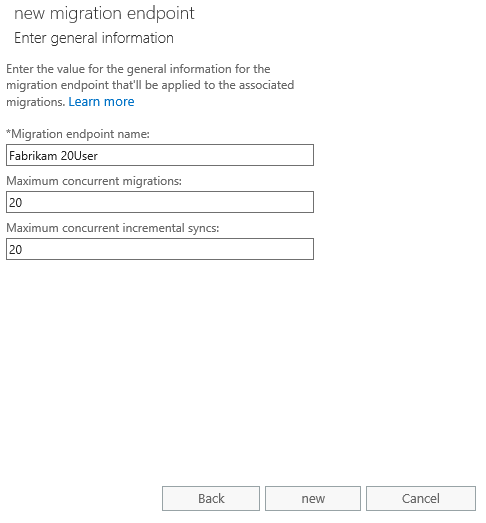 EndPoint Name, 최대 동시 마이그레이션 사서함 숫자, 증분동기화 숫자를 입력합니다.