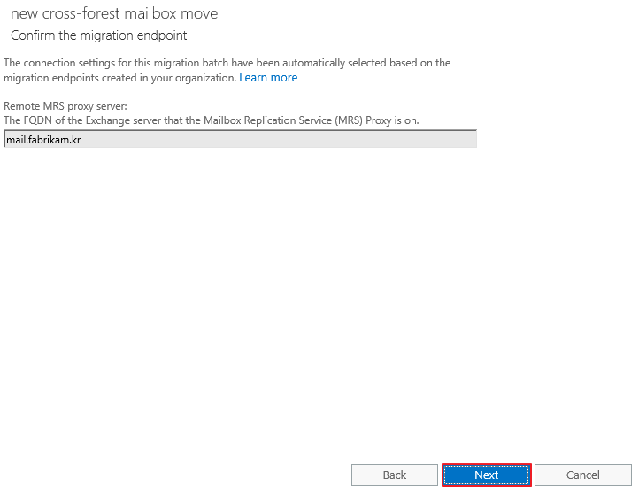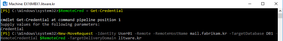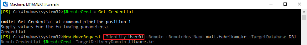 New-MoveRequest -Identity User01 -Remote -RemoteHostName mail.fabrikam.kr -TargetDatabase DB1 -