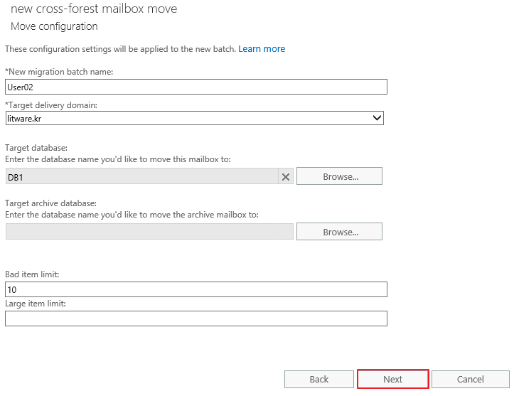 Litware.kr 에서 ExchangeGuid 를 입력한 뒤, 마이그레이션을 진행합니다.