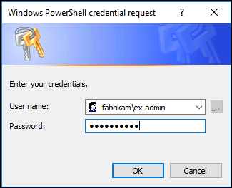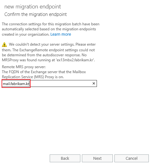 Fabrikam.kr 의 Exchange Admin 계정 정보를 입력합니다.