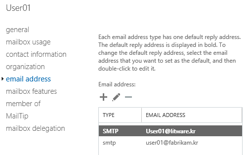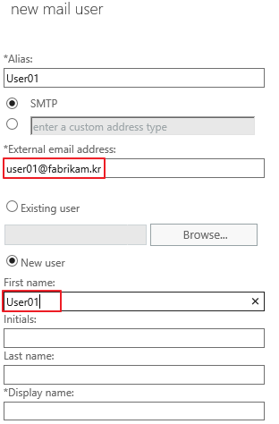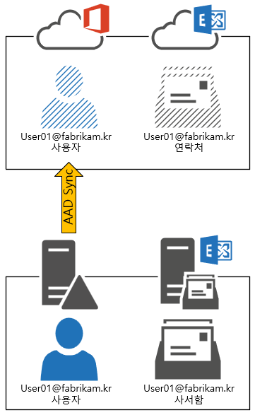 Fabrikam.kr 에서는 User01이 Mailbox -> Mail User로 변경되었습니다.