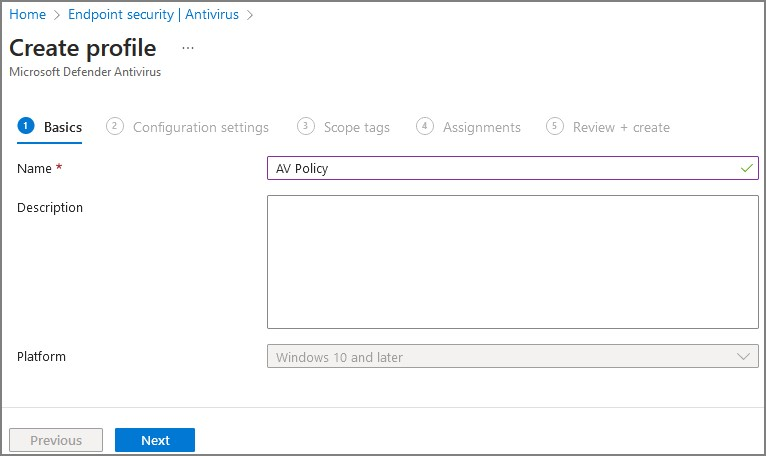 Intune 관리 센터 -> Endpoint Security -> Antivirus -> Create Policy