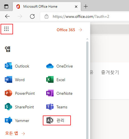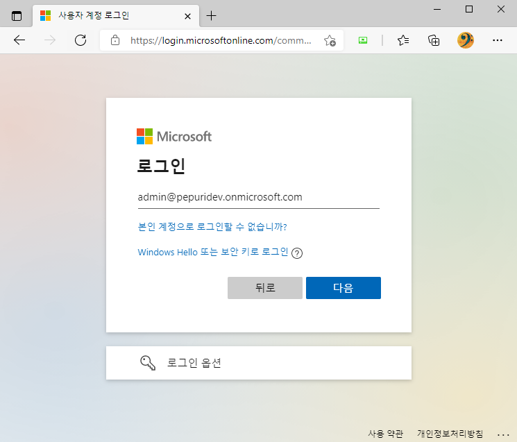 웹 브라우저 창을 완전히 종료한 뒤, 생성된 관리자 계정으로 https://office.com 에 로그인합니다.