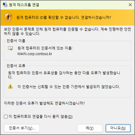 더 이상 원격 연결할 때, 인증서 경고 메시지가 나타나지 않으면서 연결됩니다.