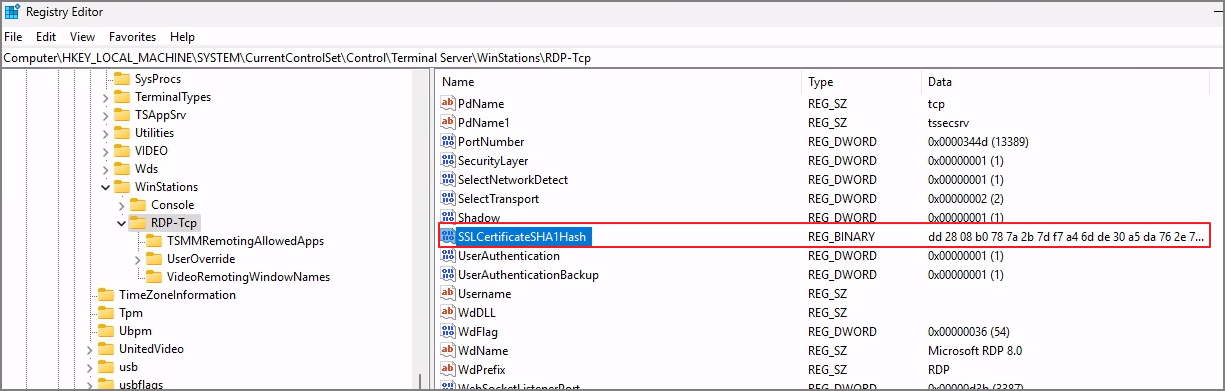 wmic /namespace:\\root\cimv2\TerminalServices PATH Win32_TSGeneralSetting Set SSLCertificateSHA1Hash="THUMBPRINT값 입력"