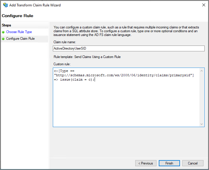 | ActiveDirectoryUserSID | c:[Type == "http://schemas.microsoft.com/ws/2008/06/identity/claims/primarysid"] => issue(claim = c); |