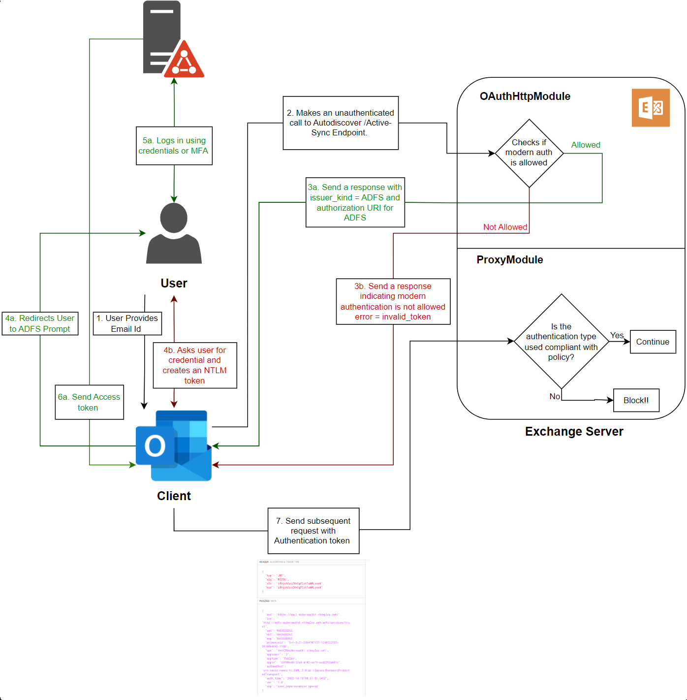 The following diagram illustrates the coordination between Exchange Server, ADFS and Outlook to authenticate a user using Modern auth.
