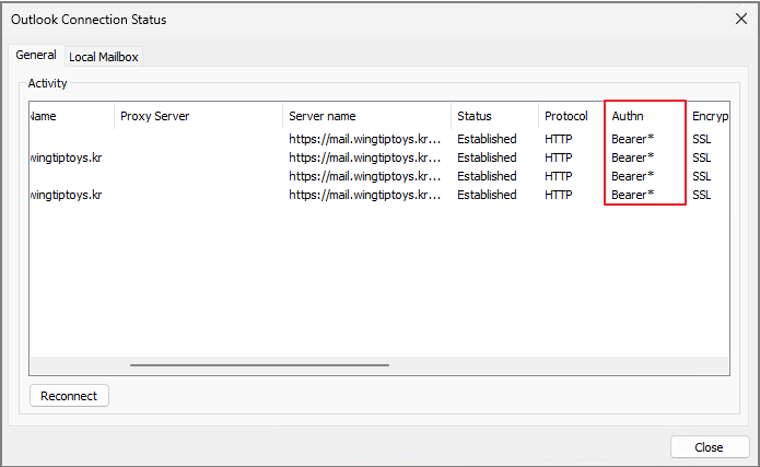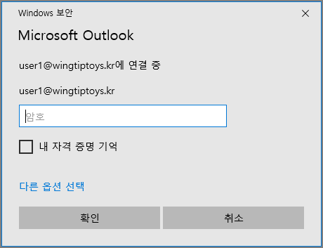 기존에는 Outlook 연결시 Windows 인증 (기본인증)창으로 나타납니다.