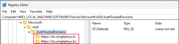 HKEY_LOCAL_MACHINE\SOFTWARE\Policies\Microsoft\AAD\AuthTrustedDomains\https://ADFS domain