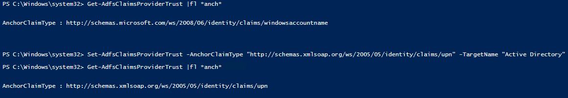 Set-AdfsClaimsProviderTrust -AnchorClaimType "http://schemas.xmlsoap.org/ws/2005/05/identity/claims/upn" -TargetName "Active Directory"