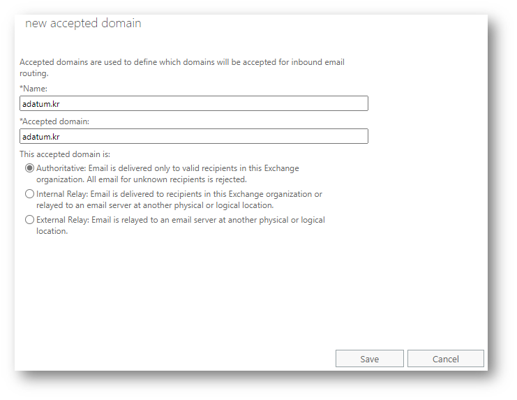 | Accepted domains are the SMTP name spaces (also known as address spaces) that you configure in an Exchange organization to receive email messages. For example, if your company registered the domain contoso.com, and you configured a mail exchanger (MX) record in your Internet DNS for contoso.com, you need to configure contoso.com as an accepted domain in your Exchange organization to accept messages that are addressed to @contoso.com recipients. 허용 도메인은 전자 메일 메시지를 받도록 Exchange SMTP 이름 공간(주소 공간)입니다. 예를 들어 회사에서 contoso.com 도메인을 등록하고 인터넷 DNS에서 contoso.com 용 MX(메일 교환기) 레코드를 구성한 경우 contoso.com 받는 사람에게 보낸 메시지를 수락하도록 Exchange 조직의 허용 도메인으로 contoso.com 구성해야 합니다. |