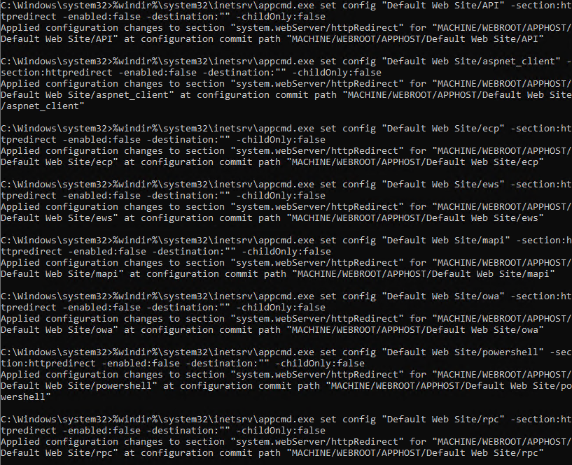 %windir%\system32\inetsrv\appcmd.exe set config "Default Web Site/ecp" -section:httpredirect -enabled:false -destination:"" -childOnly:false