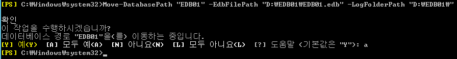 Move-DatabasePath "EDB01" -EdbFilePath "D:\EDB01\EDB01.edb" -LogFolderPath "D:\EDB01\"