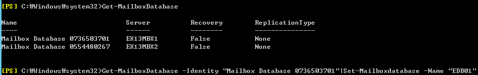 Get-MailboxDatabase -Identity "Mailbox Database 0736503701"|Set-Mailboxdatabase -Name "EDB01"