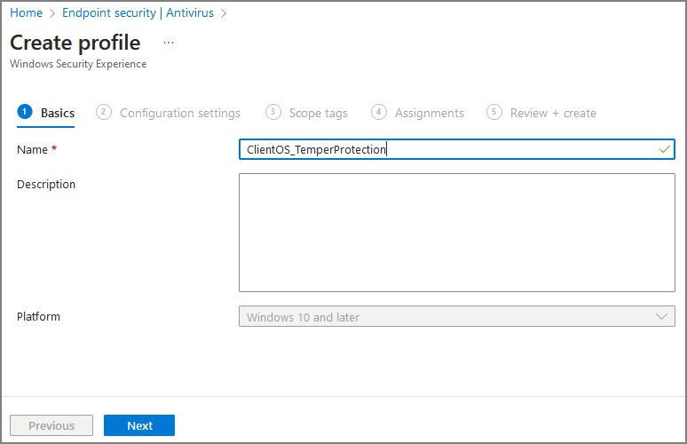 Platform: Windows 10, Windows 11, and Windows Server , Profile: Microsoft Defender Antivirus 선택