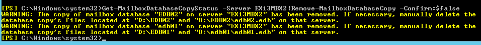 Get-MailboxDatabaseCopyStatus -Server EX13MBX2|Remove-MailboxDatabaseCopy -Confirm:$false