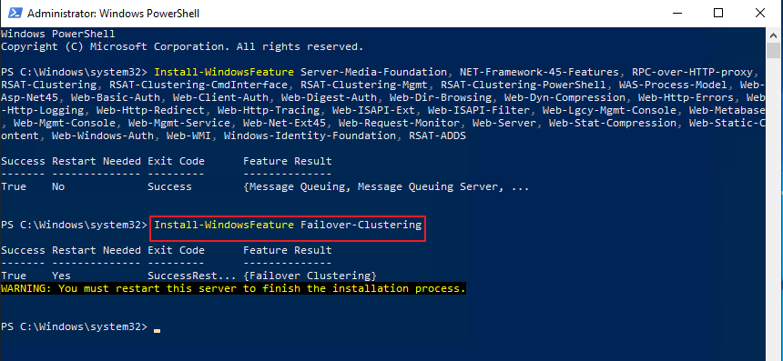 참고로 DAG에 추가될 예정이기 때문에 사전에 Failover-Clustering 기능을 설치하는 것을 권장합니다.