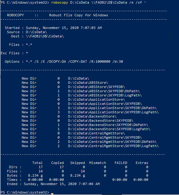 robocopy D:\CsData \\FADB2\D$\CsData /e /xf *