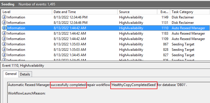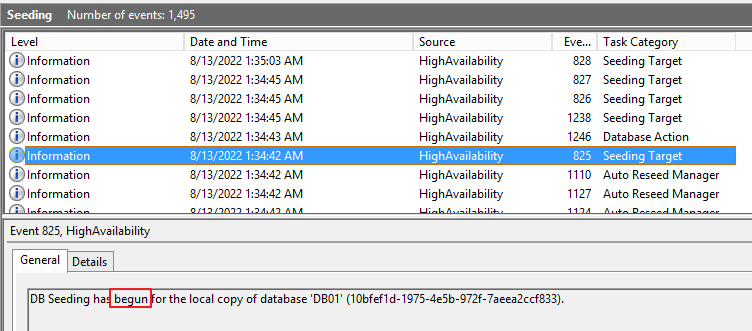 Event Viewer -> Applications and Services Logs -> Microsoft -> Exchange -> HighAvailability -> Seeding 으로 이동합니다.