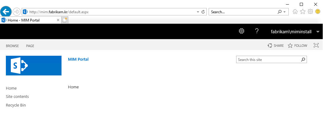 http://mim.fabrikam.kr/IdentityManagement URL 접속 (아래의 스크린샷은 SSL 인증서를 바인딩하였기 때문에 https 입니다.)