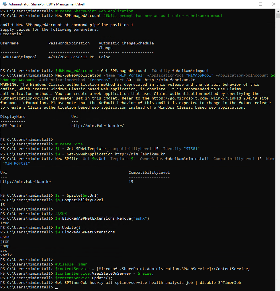 New-SpWebApplication -Name "MIM Portal" -ApplicationPool "MIMAppPool" -ApplicationPoolAccount $dbManagedAccount -AuthenticationMethod "Kerberos" -Port 80 -URL http://mim.fabrikam.kr