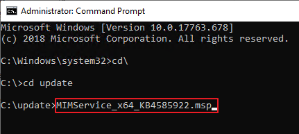 명령프롬프트를 관리자 권한으로 실행한 뒤, 업데이트 파일을 실행합니다.