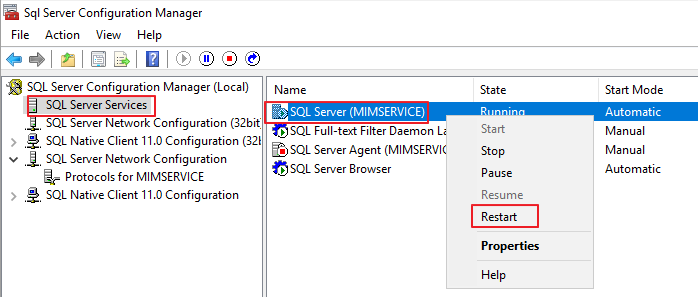 SQL Server Network Configuration - Protocols for MIMService - TCP/IP - 우클릭 - Properties