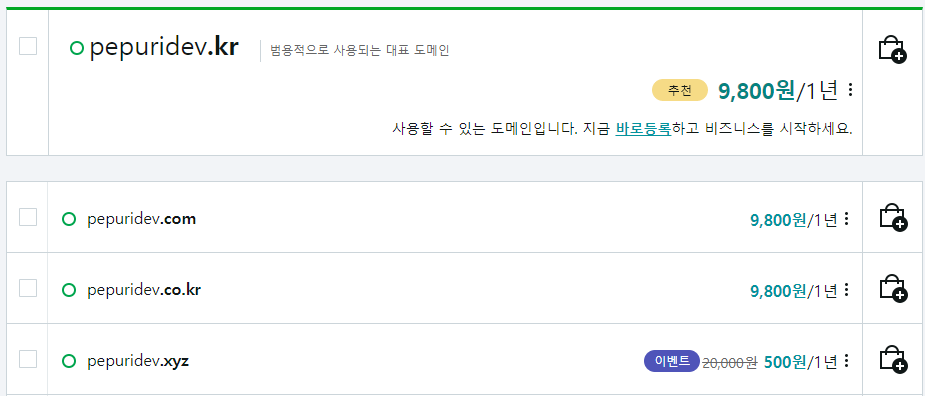 그리고 처음 도메인을 구입 할 때, .kr 이나 .com 을 구입하는 것을 권장합니다.