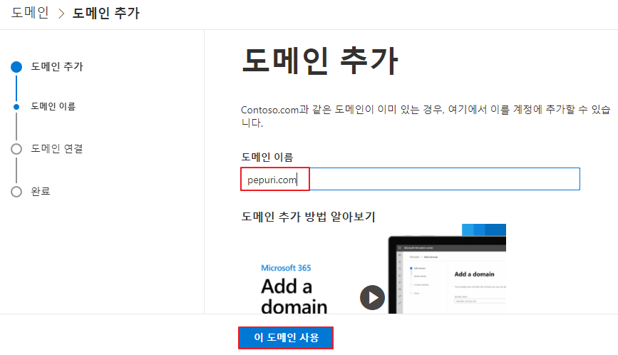 도메인 구매가 완료되었다면, M365 관리센터 - 설정 - 도메인 메뉴로 이동합니다.