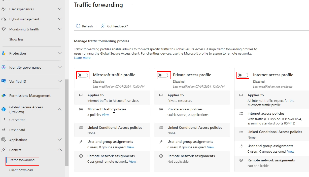 Connect -> Traffic forwarding -> 각각의 프로필을 활성화합니다.