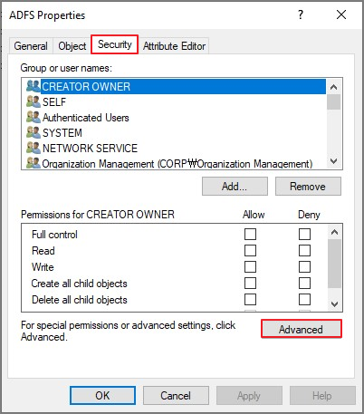 ADUC → 도메인 → Program Data → Microsoft → ADFS → Properties
