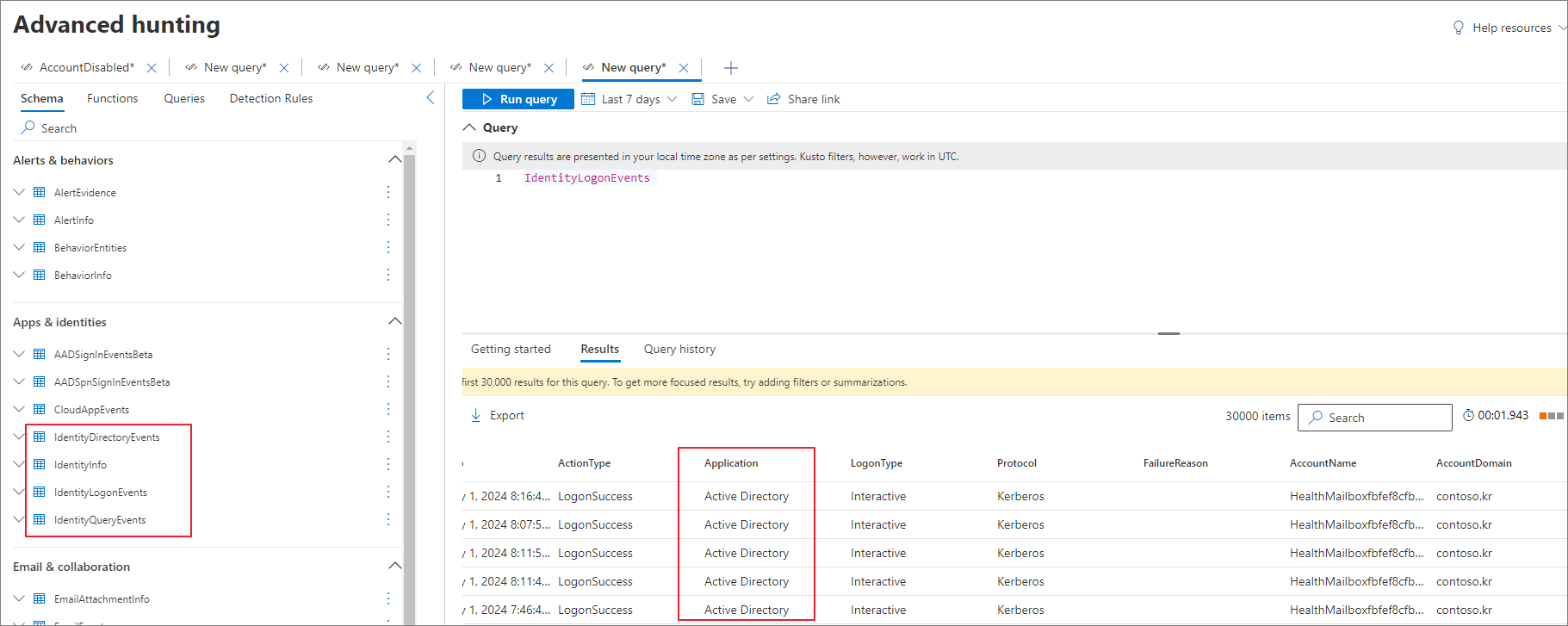 구성이 완료되면 아래와 같이 Advanced hunting에서 Identity와 관련된 기록이 조회되는 것을 확인할 수 있습니다.