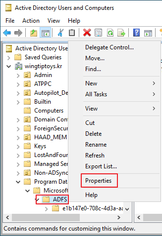 Active Directory Users and Computer -> Program Data -> Microsoft -> ADFS -> 우클릭 -> Properties
