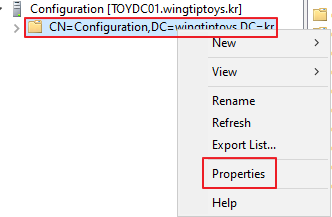 CN=Configuration,DC=~~~ 우클릭 -> Properties