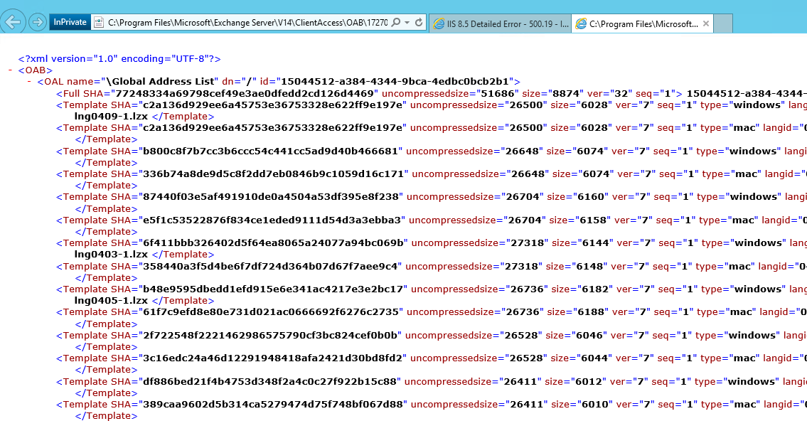 C:\Program Files\Microsoft\Exchange Server\V14\ClientAccess\OAB\GUID\oab.xml 파일이 열리는지 확인