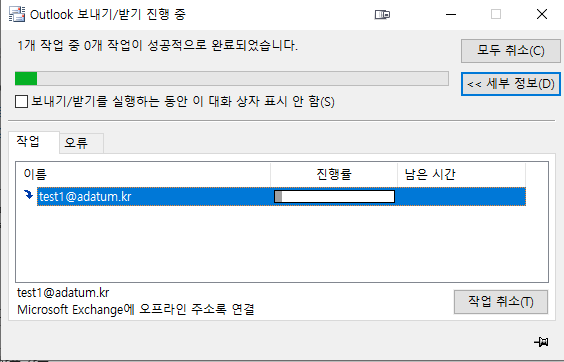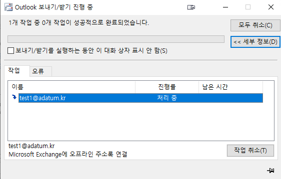 Outlook 상에서 주소록을 수동으로 다운로드시 아래와 같이 처리 중에서 더 이상 진행되지 않음