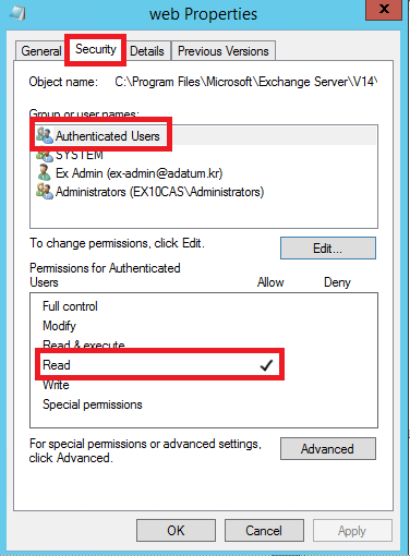 각각의 파일 및 폴더에서 Authenticated Users 에 Read 권한 부여
