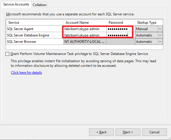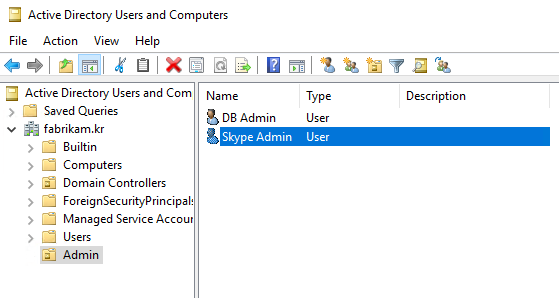 SQL과 Skype 의 서비스 계정을 생성합니다.