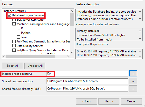 기능 선택시 Database Engine Services 를 선택 - Instance 경로는 D드라이브로 선택하였습니다.