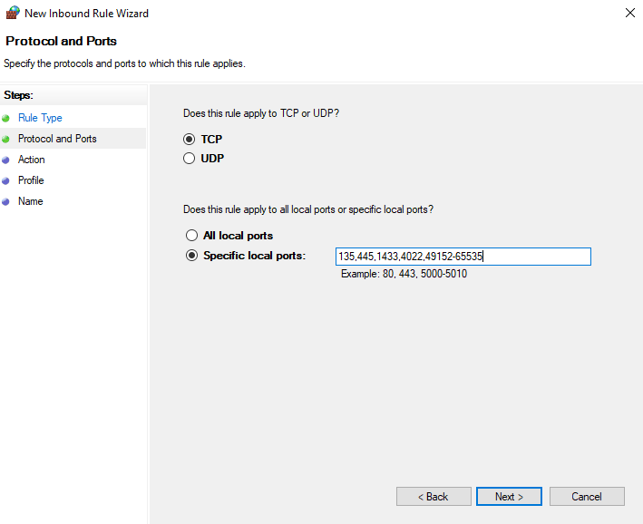TCP - 135, 445, 1433, 4022, 49152-65535 지정 후 Next - 사실 해당 설정은 SCCM과 동일하게 했습니다. 이것보다 필수 포트는 적을 수 있습니다.