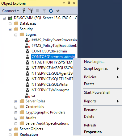 Security - Logins - 서비스계정 우클릭 - Properties