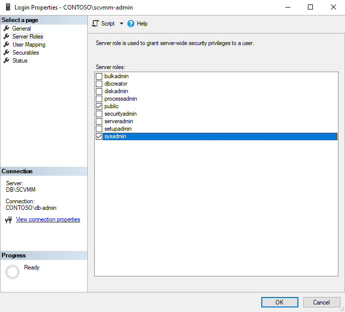 Server Roles 에서 sysadmin 지정