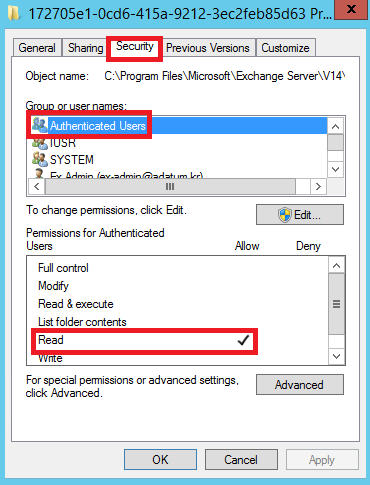 각각의 파일 및 폴더에서 Authenticated Users 에 Read 권한 부여