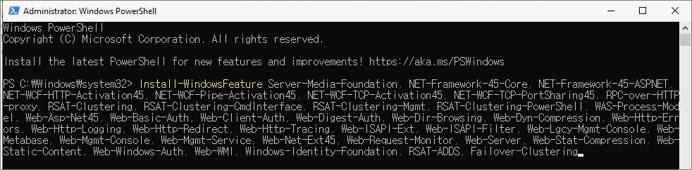 Install-WindowsFeature Server-Media-Foundation, NET-Framework-45-Features, RPC-over-HTTP-proxy, RSAT-Clustering, RSAT-Clustering-CmdInterface, RSAT-Clustering-Mgmt, RSAT-Clustering-PowerShell, WAS-Process-Model, Web-Asp-Net45, Web-Basic-Auth, Web-Client-Auth, Web-Digest-Auth, Web-Dir-Browsing, Web-Dyn-Compression, Web-Http-Errors, Web-Http-Logging, Web-Http-Redirect, Web-Http-Tracing, Web-ISAPI-Ext, Web-ISAPI-Filter, Web-Lgcy-Mgmt-Console, Web-Metabase, Web-Mgmt-Console, Web-Mgmt-Service, Web-Net-Ext45, Web-Request-Monitor, Web-Server, Web-Stat-Compression, Web-Static-Content, Web-Windows-Auth, Web-WMI, Windows-Identity-Foundation, RSAT-ADDS, Failover-Clustering
