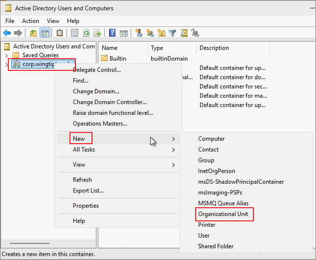도메인 -> 우클릭 -> New -> Organizational Unit (OU)