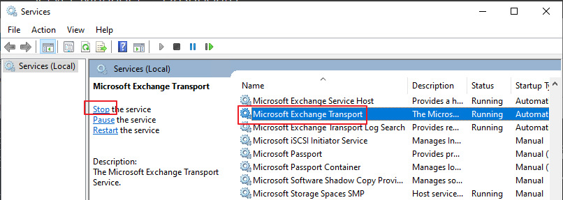 Microsoft Exchange Transport 서비스를 중지합니다.