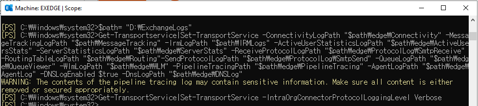 Get-Transportservice|Set-TransportService -ConnectivityLogPath "$path\edge\Connectivity" -MessageTrackingLogPath "$path\MessageTracking" -IrmLogPath "$path\IRMLogs" -ActiveUserStatisticsLogPath "$path\edge\ActiveUsersStats" -ServerStatisticsLogPath "$path\edge\ServerStats" -ReceiveProtocolLogPath "$path\edge\ProtocolLog\SmtpReceive" -RoutingTableLogPath "$path\edge\Routing"-SendProtocolLogPath "$path\edge\ProtocolLog\SmtpSend" -QueueLogPath "$path\edge\QueueViewer" -WlmLogPath "$path\edge\WLM" -PipelineTracingPath "$path\edge\PipelineTracing" -AgentLogPath "$path\edge\AgentLog" -DNSLogEnabled $true -DnsLogPath "$path\edge\DNSLog"