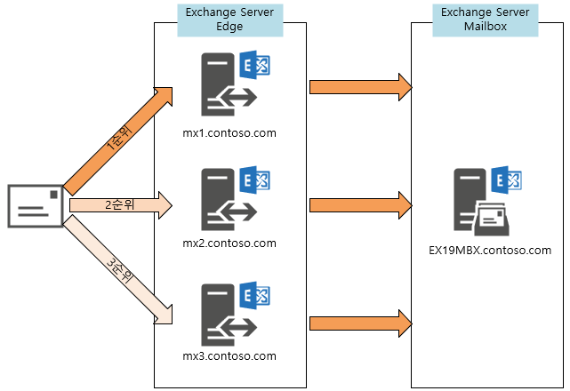 mx1.contoso.com이 문제가 발생된다면, 2순위로 전달할 것입니다.